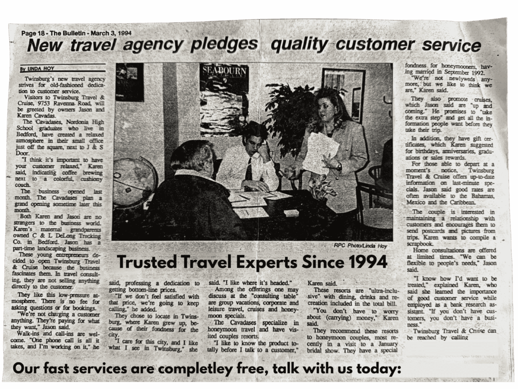 As an Owner of Twinsburg Travel you may be in contact with me throughout the booking process.